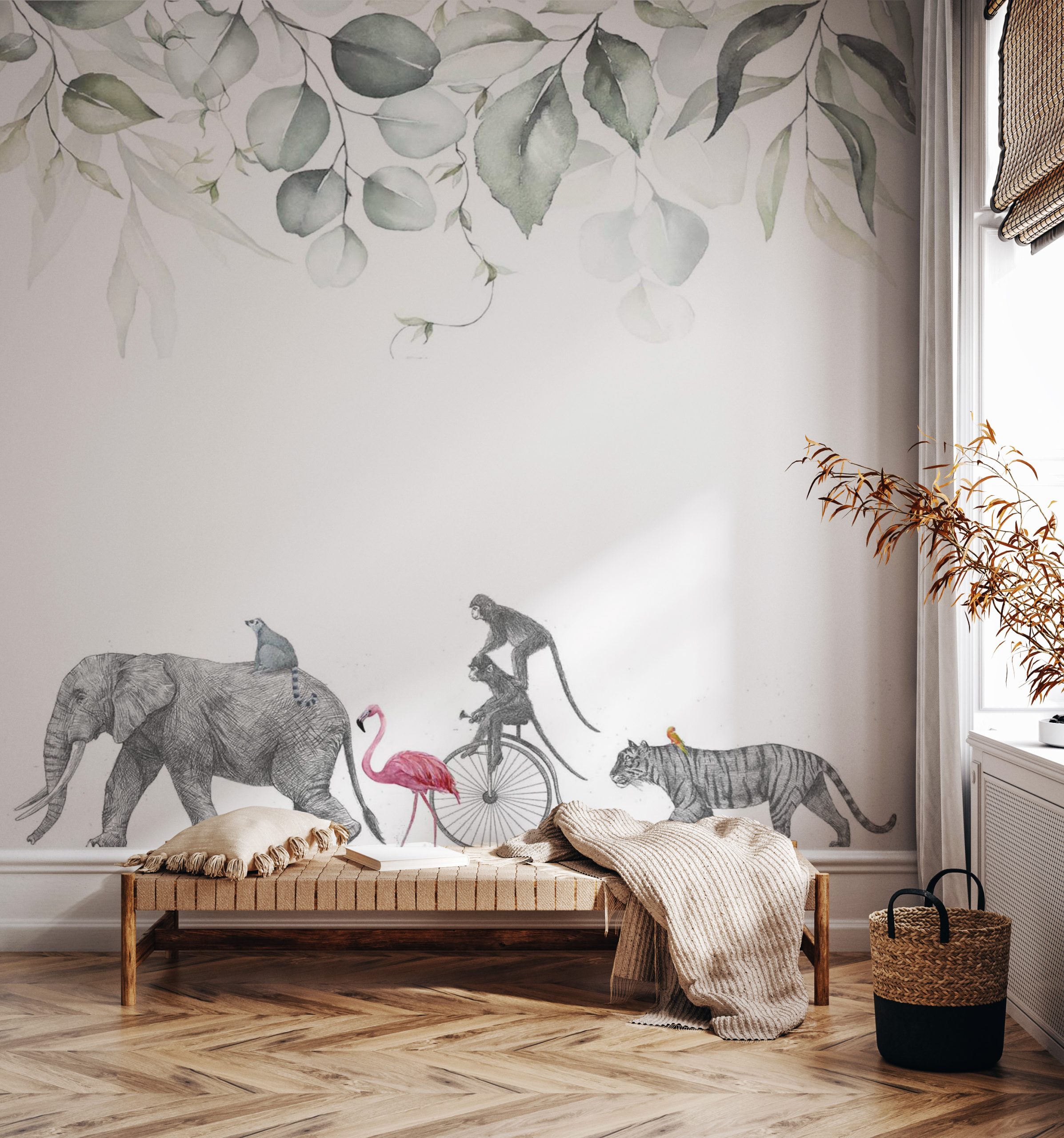 Transform your space into a lush, vibrant jungle with our Jungle Walk Wallpaper. This stunning design features a variety of jungle animals, including elephants, monkeys, tigers, and colorful birds, set against a backdrop of lush foliage. The high-quality, durable material ensures a long-lasting and eye-catching addition to any room in your home. Whether you’re looking to create a tropical oasis in your living room or a playful atmosphere in a child’s bedroom, this wallpaper is sure to make a statement. Bring the beauty and excitement of the jungle into your home with our Jungle Walk Wallpaper.